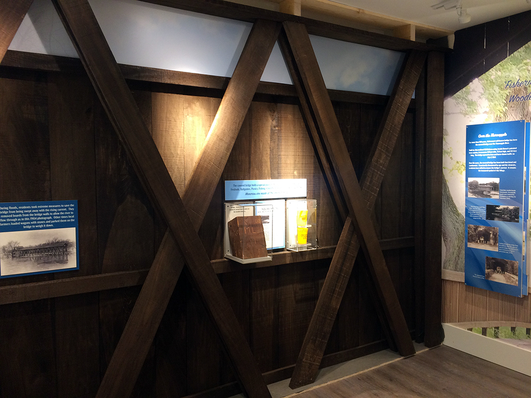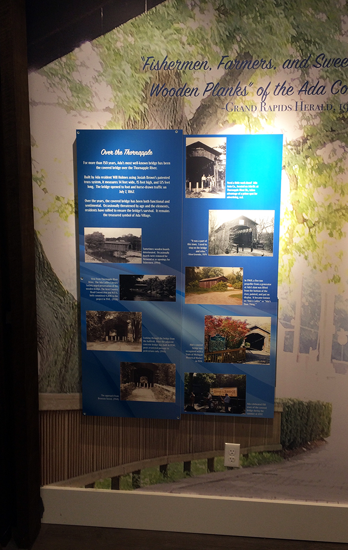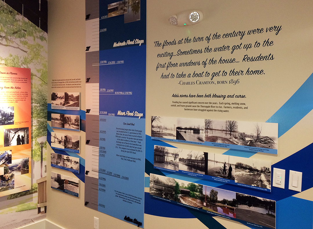 This exhibit features a reproduction scale wall from Ada Covered Bridge, along with lots of historical images featuring the rivers, bridges, and dams in Ada. There are sliding graphic panels, a flood gauge showing historical water levels from the last 40 years, and some cool artifacts.