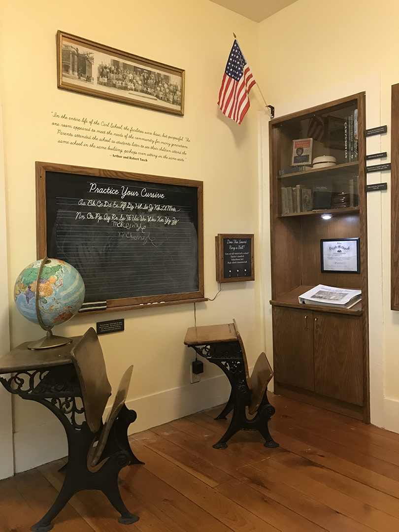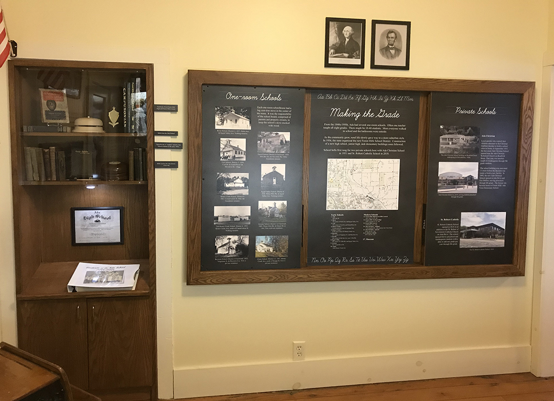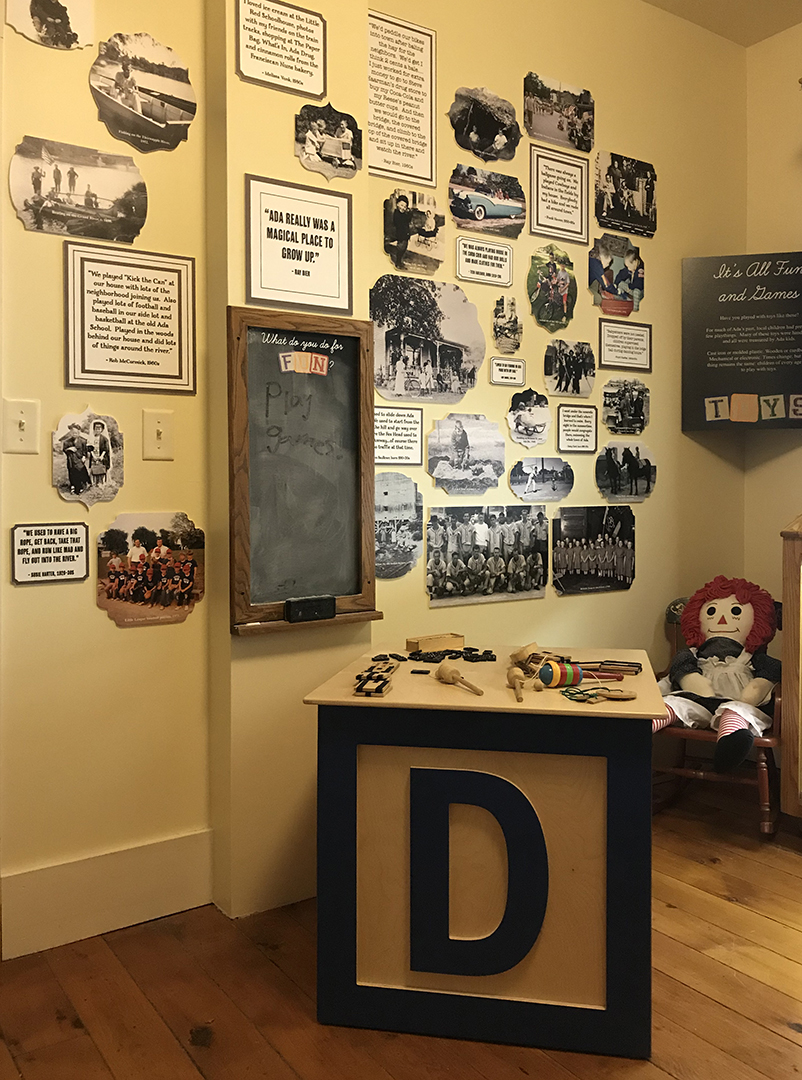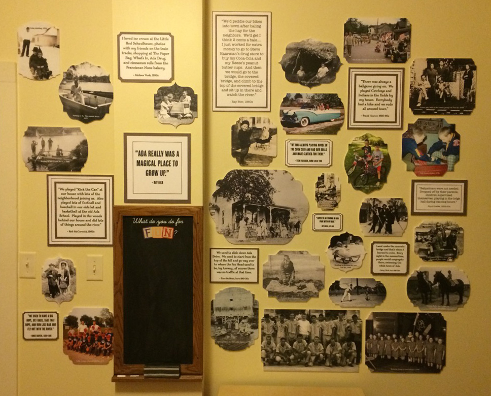 This exhibit features sliding mock chalkboard graphic panels along with actual chalkboards for visitors to practice cursive writing and share childhood memories. There is an audio interactive with different school bell sounds, and a collage of images of children playing in early Ada.
