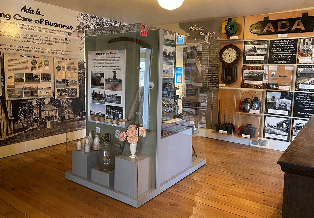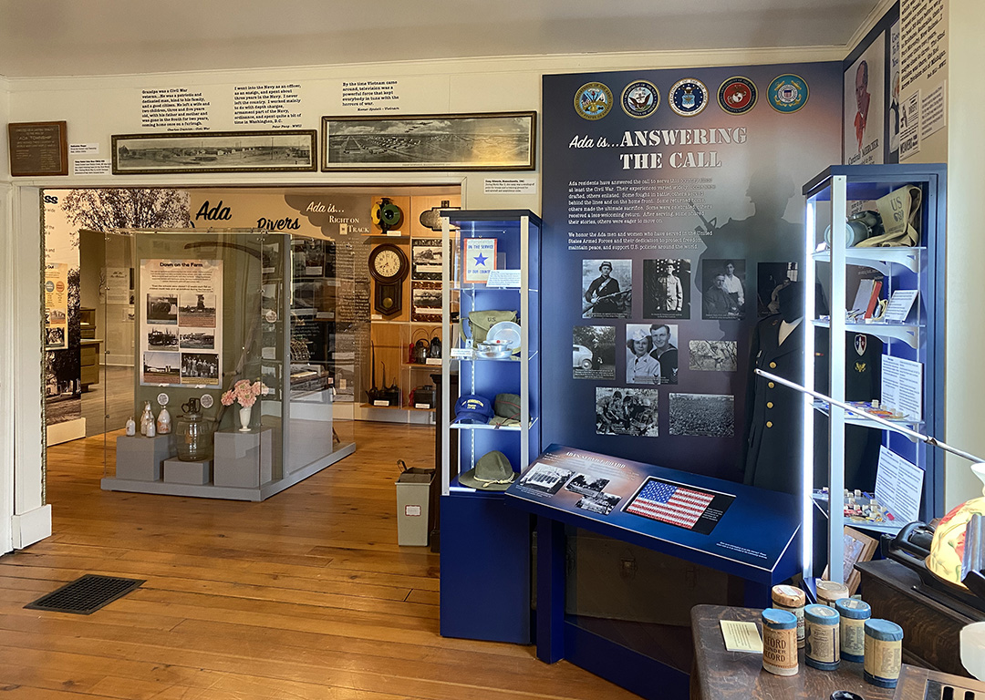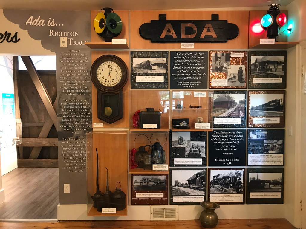 Ada’s railroading history is on display in a grid design that showcases artifacts and photographs on a single wall.