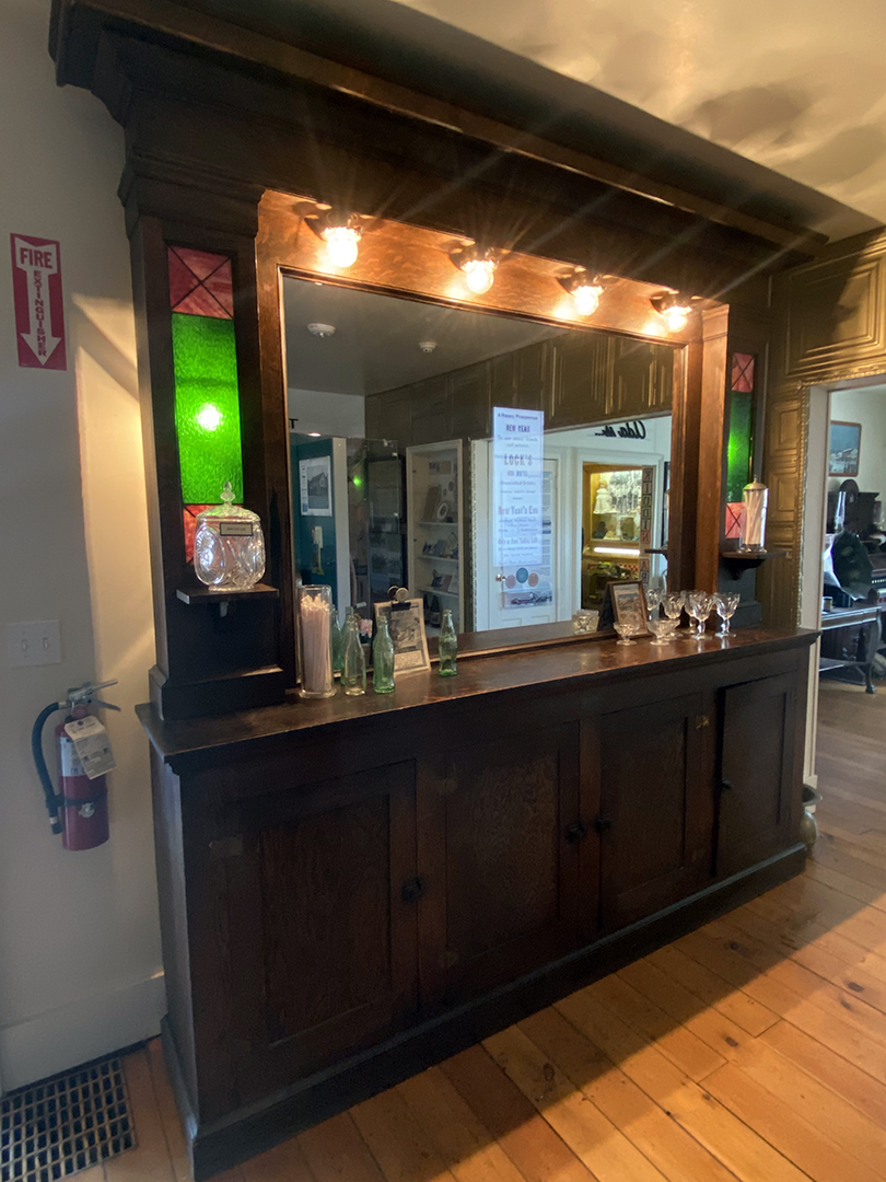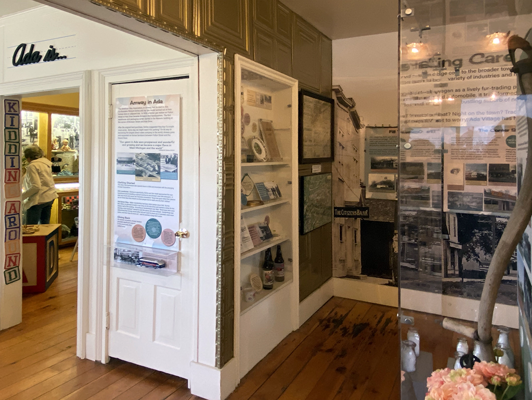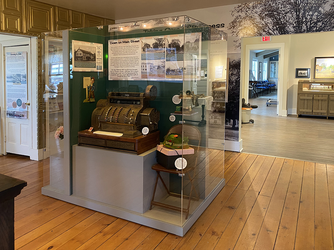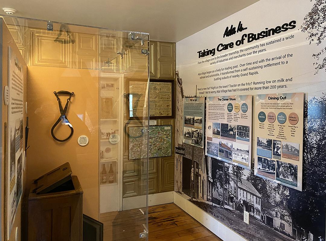 A soda fountain mirror became slide show screen in this exhibit talking about business in Ada. The exhibit also features include a custom center kiosk in the room displaying artifacts.