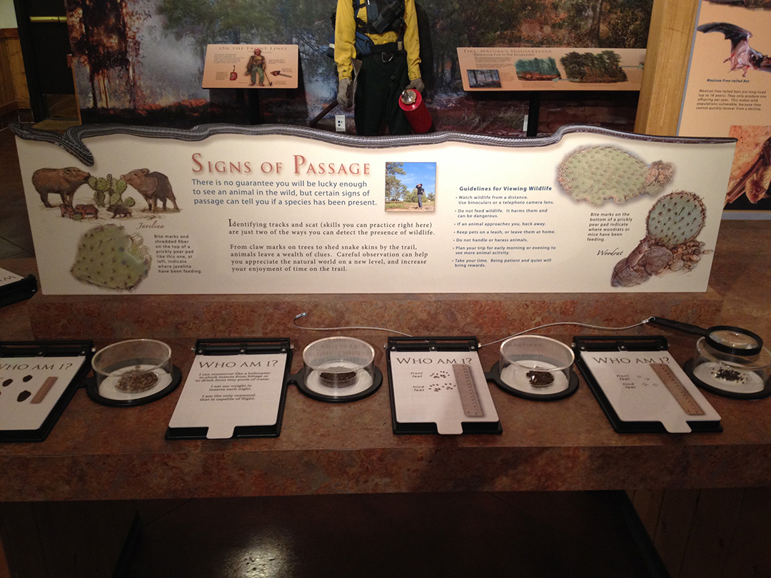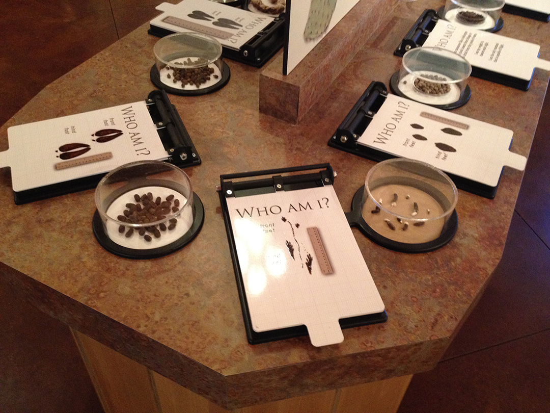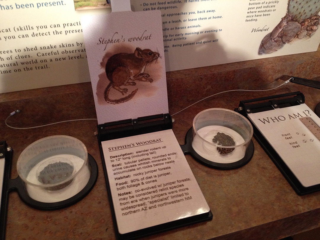 Individually mounted specimen containers with magnifying tops display scat samples alongside flip panels giving information about the specimens and the animals that left them behind.