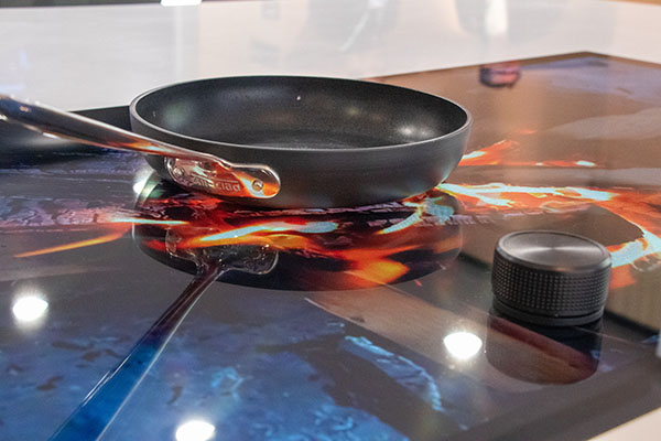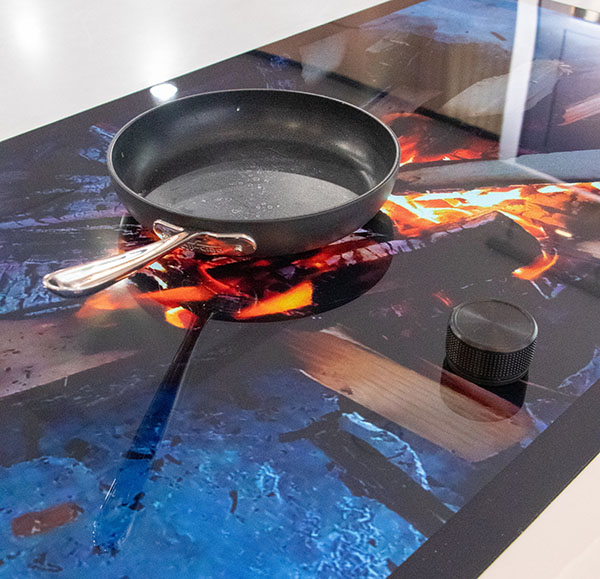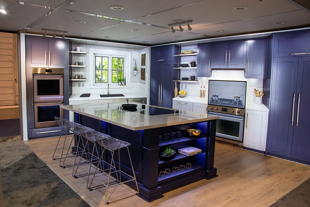 The focus on this booth was touch screen technology used as a cooktop, developed by GHSP. We built the kitchen island to house the cooktop, and then fabricated backlit fabric wall graphics to simulate kitchen cabinets. The graphic walls had cutout openings in them for more electronic displays used to simulate ovens and stovetops.