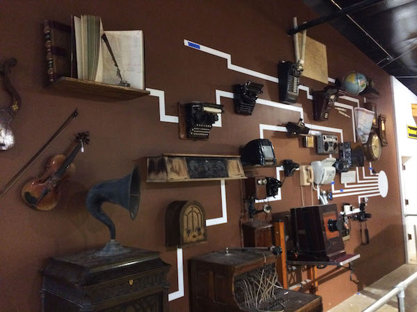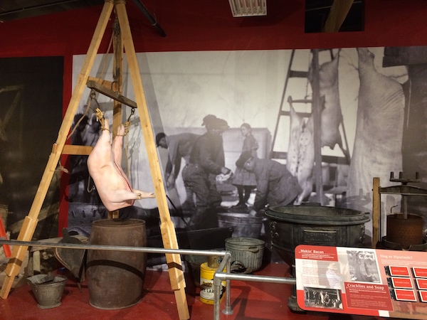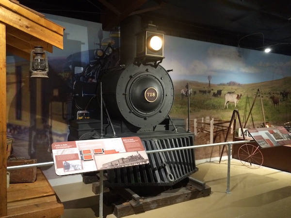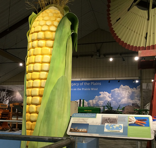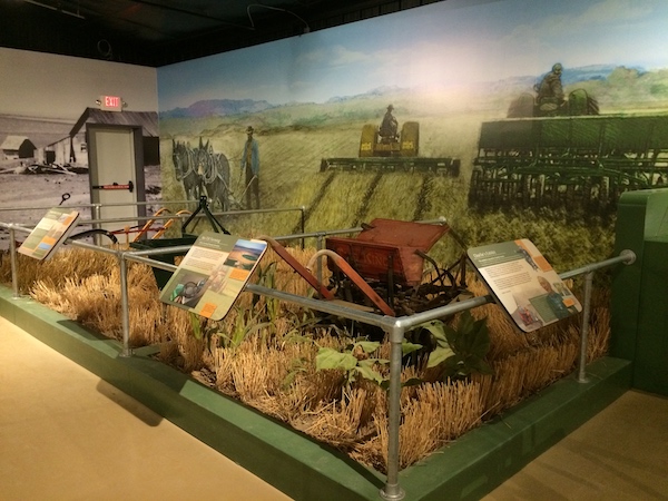 Multiple exhibits featuring all things farming and industry related. Small kiosks with mounted artifacts, technology timelines, recreations of farm fields and livestock butchering, railroad and steam train vignettes, interactive panels, and magnified crops are all features of these exhibits.