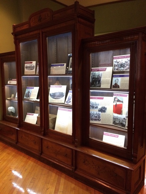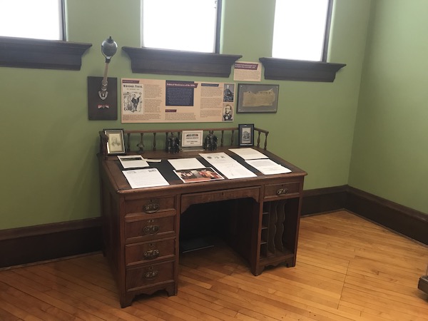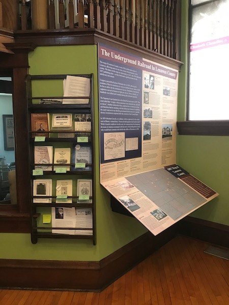 This exhibit is the first new permanent exhibit the museum has installed in over 10 years. The exhibit design utilizes a large bookcase from the museum’s collection as a display case for artifacts with the addition of some under-shelf LED lights, and vinyl graphics over the large windows in the gallery. There is also an 1857 county plat map with graphic enhancement to show locations of known Underground Railroad stops and other anti-slavery supporters.