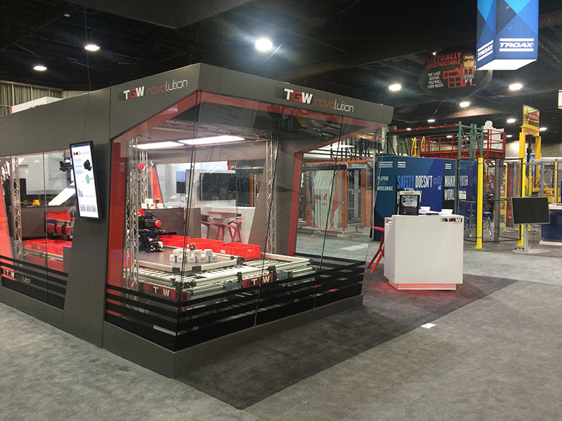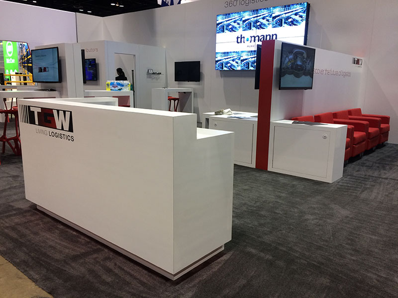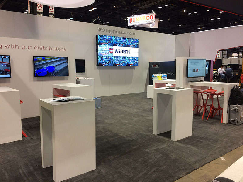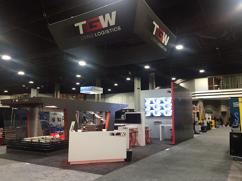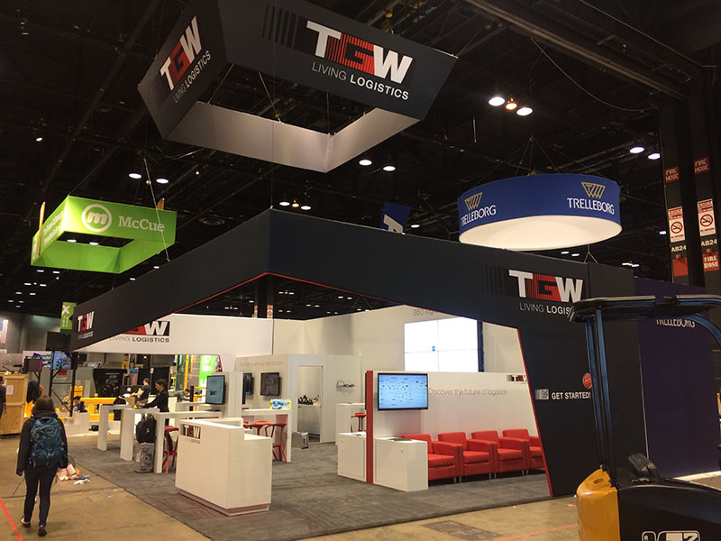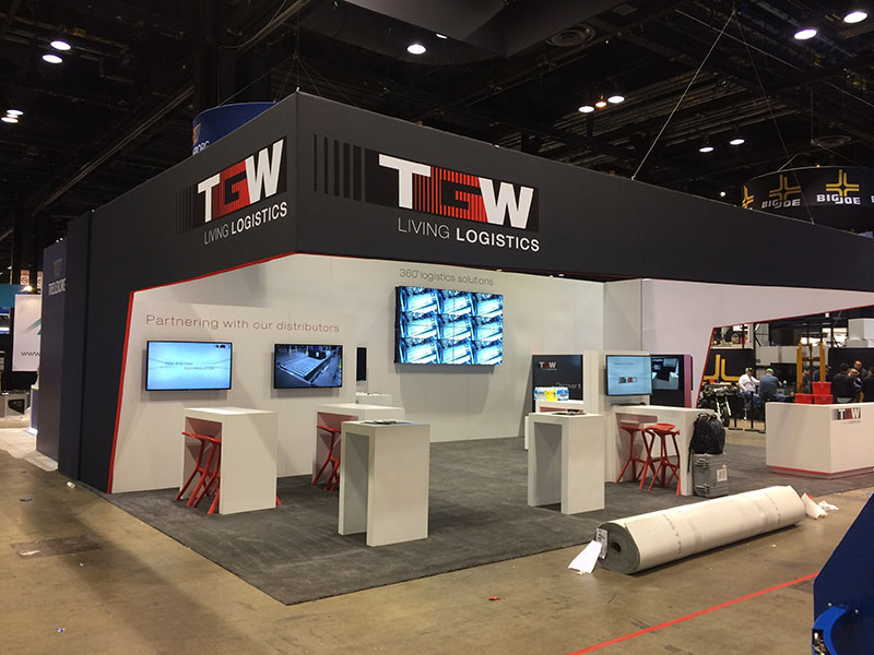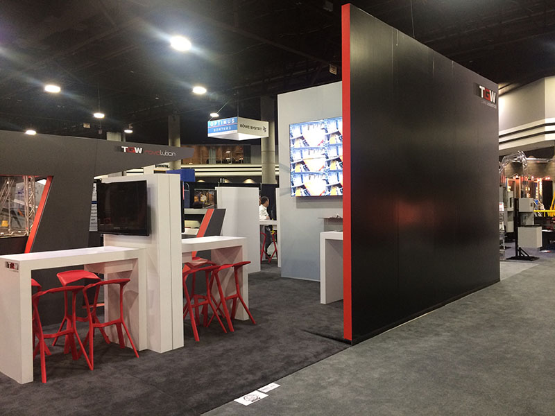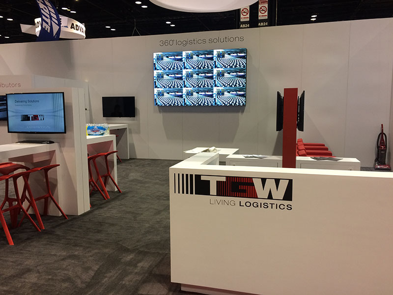 Custom 10’ x 20’ tradeshow booth featuring multiple video screens, semi-private meeting areas, and various interaction spaces.
